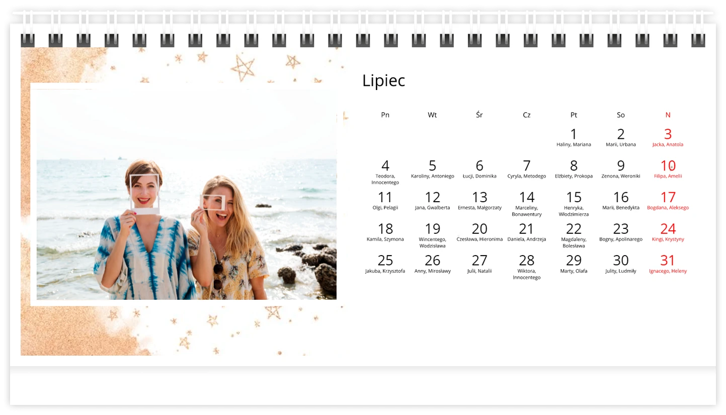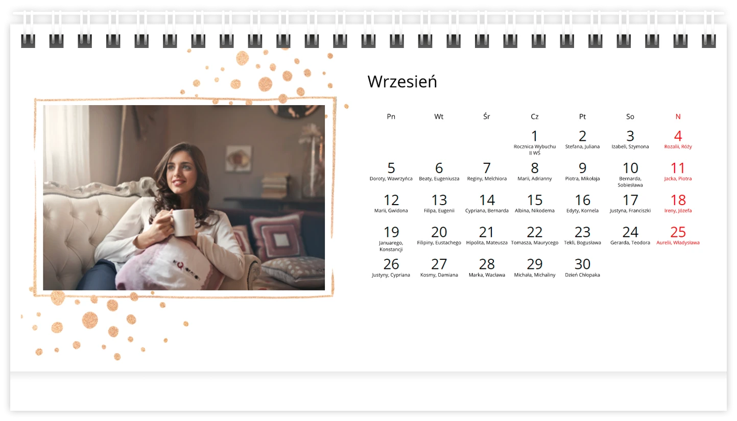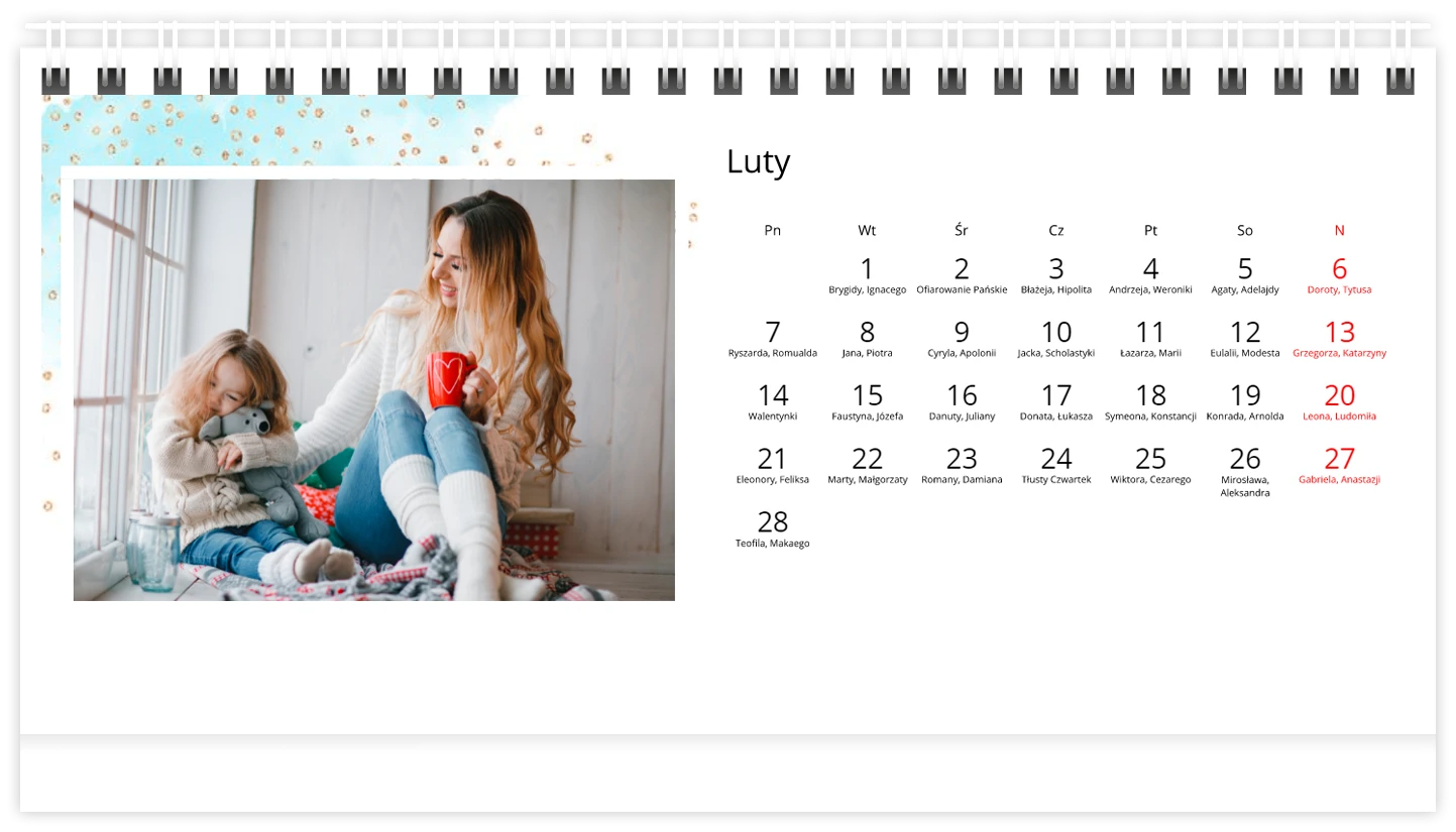 Kalendarze drukujemy na matowym papierze fotograficznym o gramaturze 235 g/m². Zapewnia on wysoką jakość wydruku, wyraźne kolory i estetyczne wykończenie, które dobrze wygląda przez cały rok.