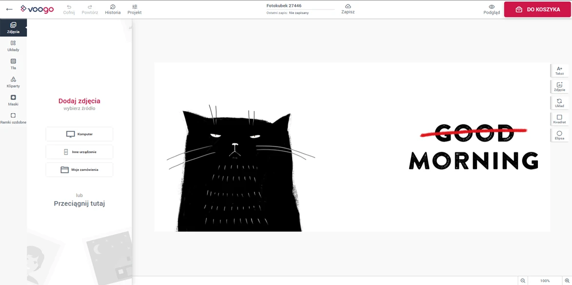 W Voogo projekt wykonasz samodzielnie w kreatorze kubków online. Nie potrzebujesz grafika ani specjalistycznych programów. Wystarczy kilka minut, aby stworzyć kubek z logo firmy, kubek z napisem lub kubek ze zdjęciem. W kreatorze możesz: wgrać logo w wysokiej jakości, dodać własny tekst, wybrać czcionkę, dopasować kolorystykę, wgrać zdjęcie z telefonu lub komputera, ustawić położenie nadruku. To rozwiązanie idealne dla JDG i małych firm, które chcą szybko zamówić kubki reklamowe online bez dodatkowych kosztów projektu.