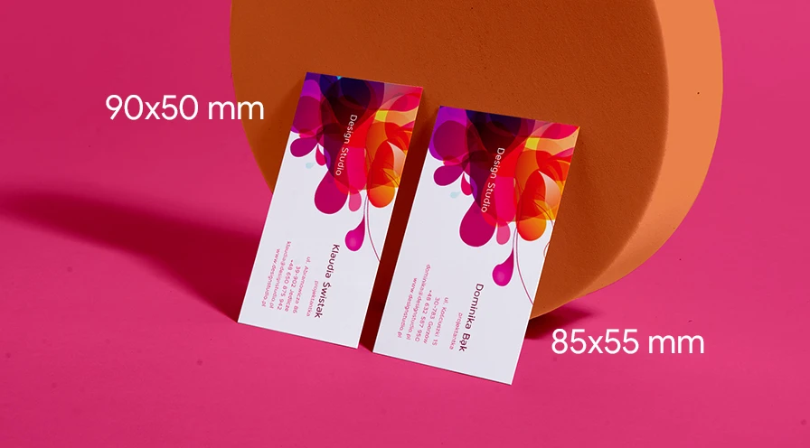Klasyczne 90×50 mm albo 85×55 mm — bardziej kompaktowe i wygodne na co dzień. Obie opcje są sprawdzone i dobrze wyglądają w każdej branży. Różnica? Ty wybierasz, co wygodniejsze dla Ciebie i Twoich klientów.