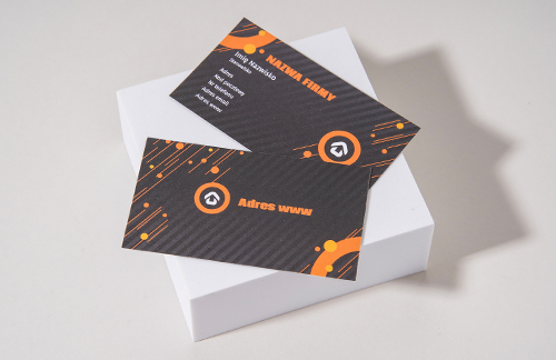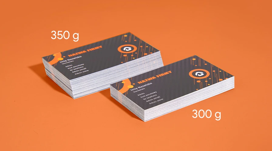 Grubość wizytówki zależy od gramatury papieru. Można ją wydrukować na papierze o gramaturze 300g/m2 lub grubszym i sztywniejszym 350g/m2.